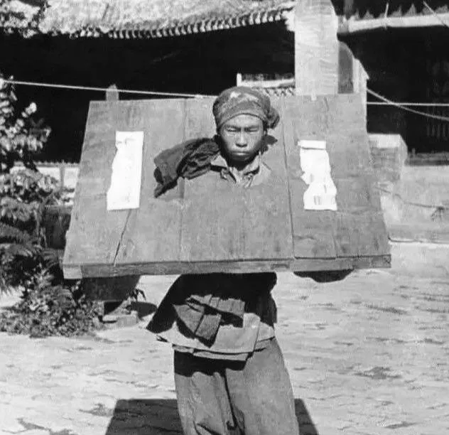 图中木板架在脖颈上叫枷,厚重的杉木或榆木做的,黑漆封面上刷着罪目,前头再牵一根麻绳,押解的人一路吆喝,走一步肩膀就被边角硌一下,夏天汗水顺着木缝往下滴,脖子被磨出血口子,小时候听奶奶说,谁家要是被戴了枷,亲戚都不敢去看,怕被认出来抹不开面子。