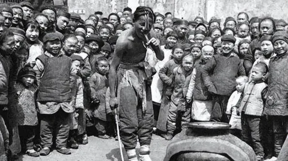 图中大缸叫行头,卖艺人赤膊握鞭,围了一圈人,帽檐翻上去的孩子把脚垫得高高的,锣鼓可能就放在缸底边上,叔叔说他小时候追着看变戏法,最怕的是火把一亮,胡子差点燎着。