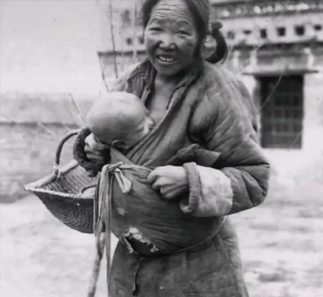 这张脸上的皱纹叫风霜,眼角全是细细的沟,笑意却从缝里往外溢,孩子在篓里找手玩,旁人看一眼就知道,这家人虽然清苦,可心还是热的。