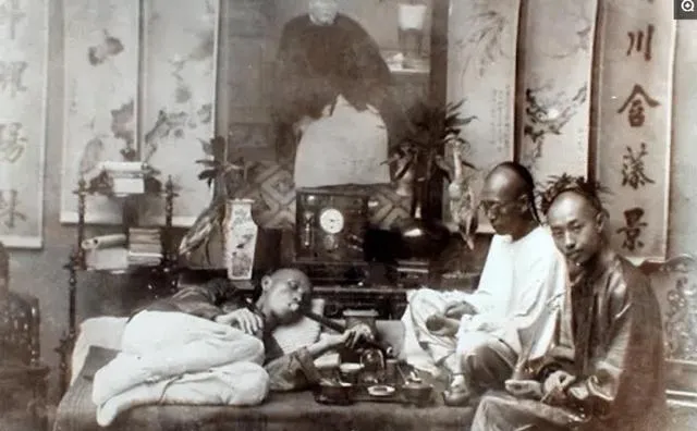 图里躺卧的姿势叫抽烟榻势,半躺半卧,手里擎着细管,旁边小孩蹲着抠地,石缝里掉着碎叶和灰渣,外公摇头,说那阵子人被拖下去可快了,现在讲究养身,老法子早就被丢在墙根。