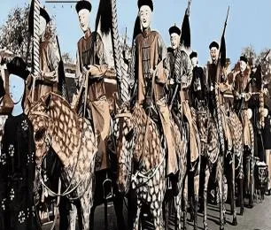 图中披甲骑队叫旗营仪仗,马身花呢像水波,旗影一溜排开,口号未必听见但队形一看就知道整,爷爷说,队伍走过土路扬尘高,走过石板只听铁掌踏踏。