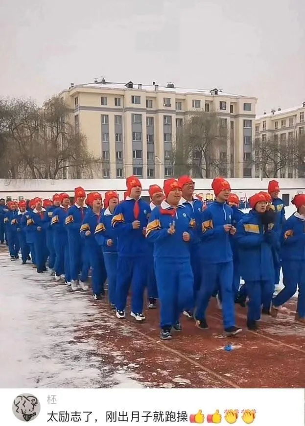 这队蓝衣红帽的年轻人一齐迈步,口号喊得响,脚印在雪里一排一排,像新刻的字,想起那会儿的犯人被牵着走,脚下也一串印子,不过越走越乱,线越来越歪,我们这代人要走的路,不该再是那条。