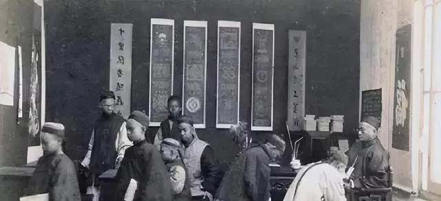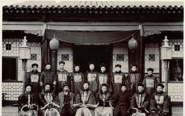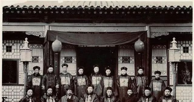 这张合影衣襟上绣的补子花样各不相同,团扇、灯笼挂在檐下,前排坐着两位胡子花白的,腿上压着领带一样的绸带,后排站得直,脸上没啥笑,像刚喊过“起立”。我喜欢这种并排的庄重,像把那天的空气都摆整齐了。