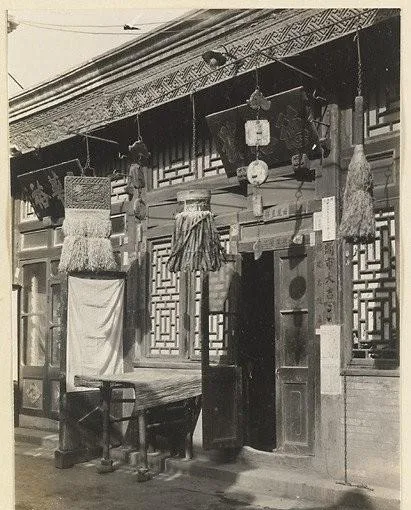 这个铺子挂的是招幌,刷帚、布帘、雕花牌子齐齐当空,一块木案横在门口,格窗是回字纹路,门楣上头压着雕花横梁,老板把家伙什儿都吊外头,告诉过路的人,来我这儿就对了。外公说老城里找铺子靠眼睛,认幌子不认招牌,风一来,幌子一晃,生意也跟着活起来。