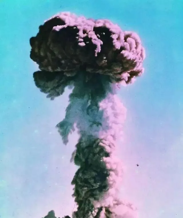 这个巨大的云叫蘑菇云,颜色从灰紫到奶白,一层层堆上去,像把天空撑破了个洞,书上讲过的那一刻被定格在这张片子里,谁都不用多解释,国家从无到有的一口气就憋在这里。