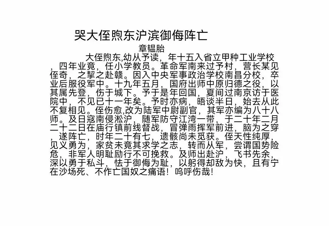 1932年2月22日,日军以锐卒5000人,挟飞机大炮进攻上海庙行镇,大舅率五二四团首当其冲,奋起抗敌,血战数时连营长相继阵亡,大舅振臂一呼,率战士直冲敌阵,终寡不敌众,中弹牺牲,年仅27岁,未婚。