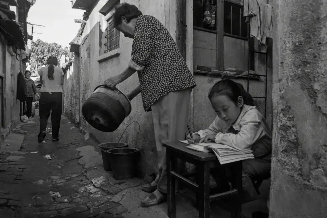 而所有这些记忆的背景板,往往是那条熟悉的、充满烟火气的小巷。就像另一张照片里的那样:老奶奶娴熟地忙活着家务,邻家妹妹坐在小凳上,专注地写着作业。