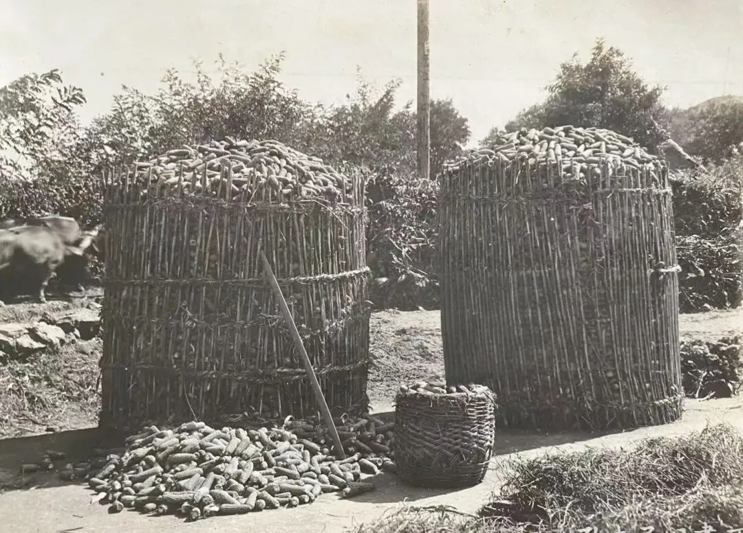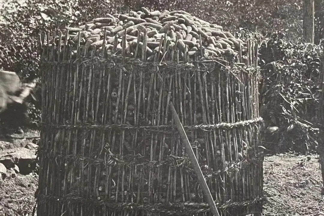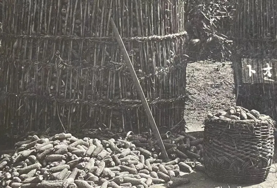 凝视这老照片,百年前开原农村在生活中产生的智慧与坚韧清晰可见。木条与秫秸经纬交织,玉米棒遵循古老的韵律向上摆放,构筑成圆满坚实的柱体。这不仅是粮食的归处,更是与天地共生的诗篇:垒叠间的缝隙,是风走过的轨迹,是阳光驻足的角落,是粮食在呼吸间完成的最后成熟。那垛沉默的金黄,承载着整个寒冬的期盼,是人间“春生夏长,秋收冬藏”最朴素的注脚。