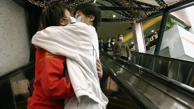 2003年4月5日,香港,一家商场的扶梯上,一对戴口罩的情侣相拥而吻。Vincent Yu/摄。