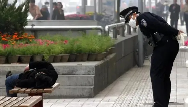 2003年4月25日,北京,一名警察保持一段距离,询问一名被群众举报为疑似非典病人的妇女。Str/摄。