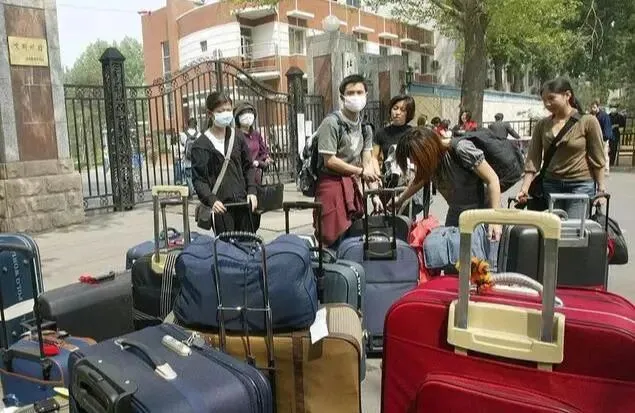 2003年4月27日,北京,泰国留学生撤离北京语言大学。Frederic J.BROWN/摄。