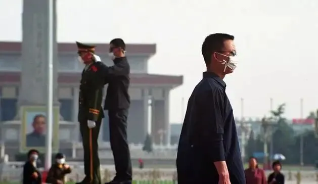 2003年4月29日,北京,通往天安门广场的桥上巡逻的工作人员。