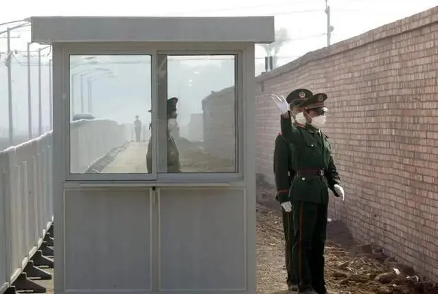 2003年5月1日,北京小汤山医院非典隔离病区外,执勤的武警。Ng Han Guan/摄。