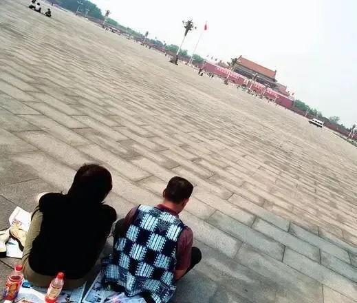 2003年5月2日,北京,天安门广场上门可罗雀,一男一女席地而坐。