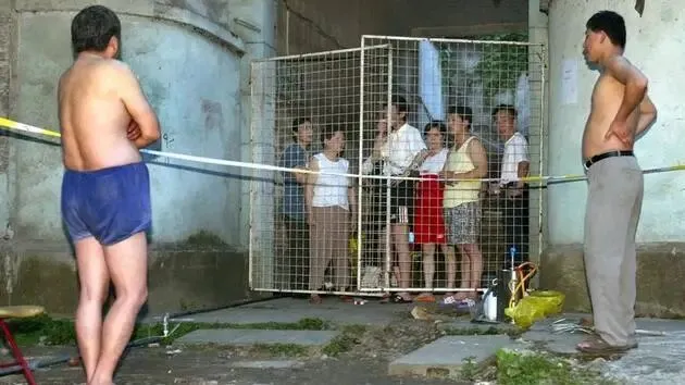 2003年5月6日,杭州老城区的一个胡同里,两位"膀爷"站在警戒线外与隔离点内的邻居叙旧情。傅拥军/摄。