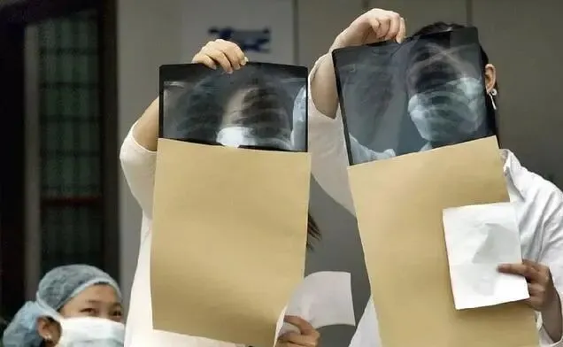 2003年5月14日,杭州市中医院发热门诊部,就医的两位感冒患者正急迫地察看自己的X光片中有无肺部感染的迹象。