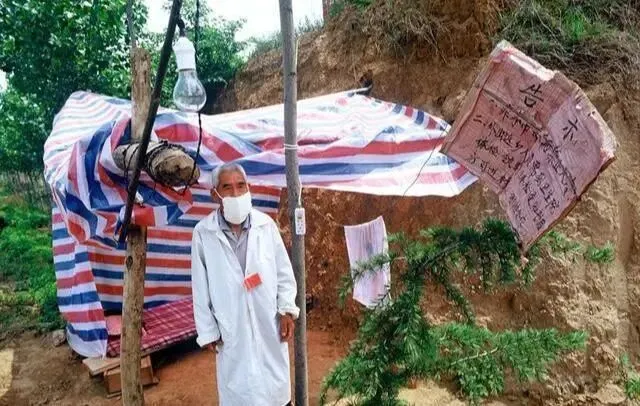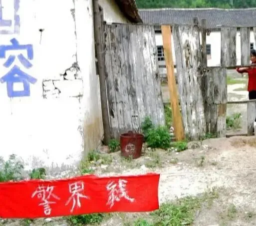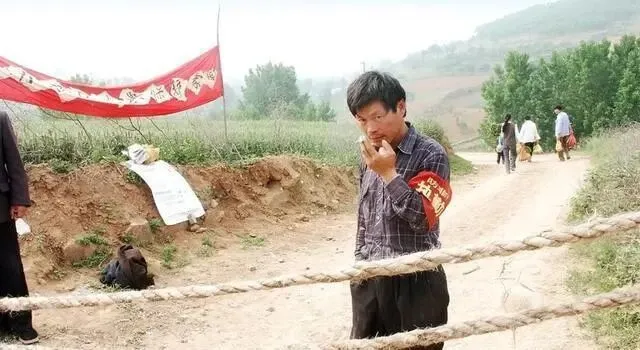 2003年5月23日,河南省洛宁县罗岭乡韩沟村村口,值班人员警觉地察看走向村口的人 。