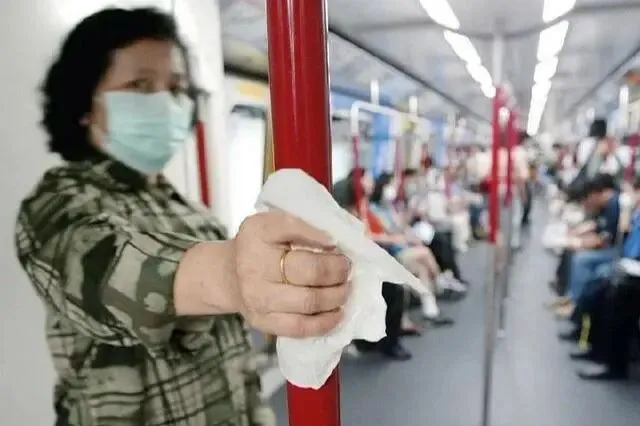 2003年5月30日,一位妇女乘坐地铁时用棉纸垫着握杆以避免感染SARS病毒。