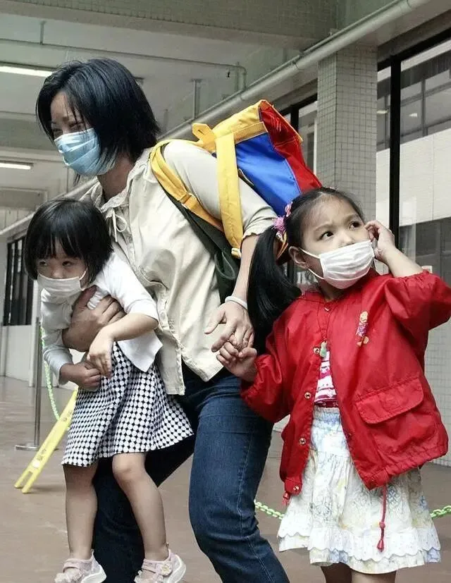 2003年9月16日,香港,一位母亲带着女儿迅速离开曾为SARS医院的玛嘉烈医院。 Laurent Fievet/摄。