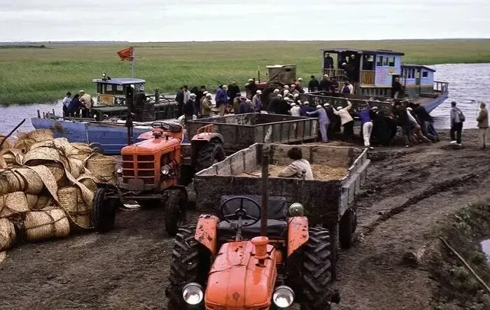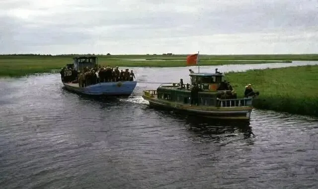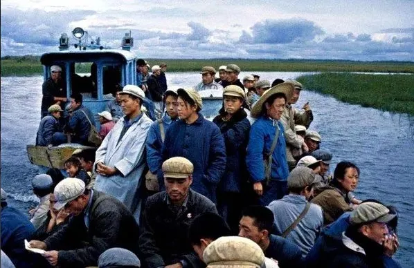 1968年,北大荒,在河边的码头,人们正忙碌地将装满粮食的麻袋从拖拉机上搬运到船上,准备通过水路运出。
