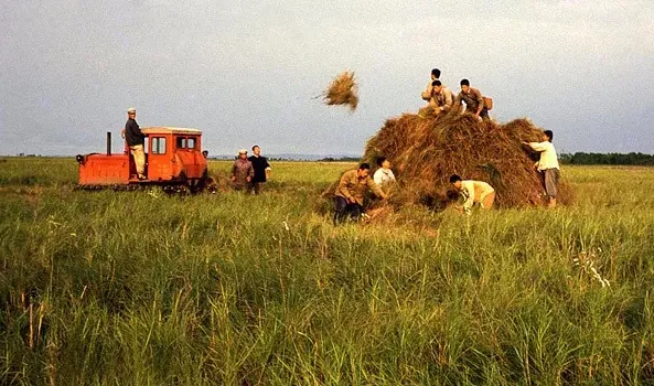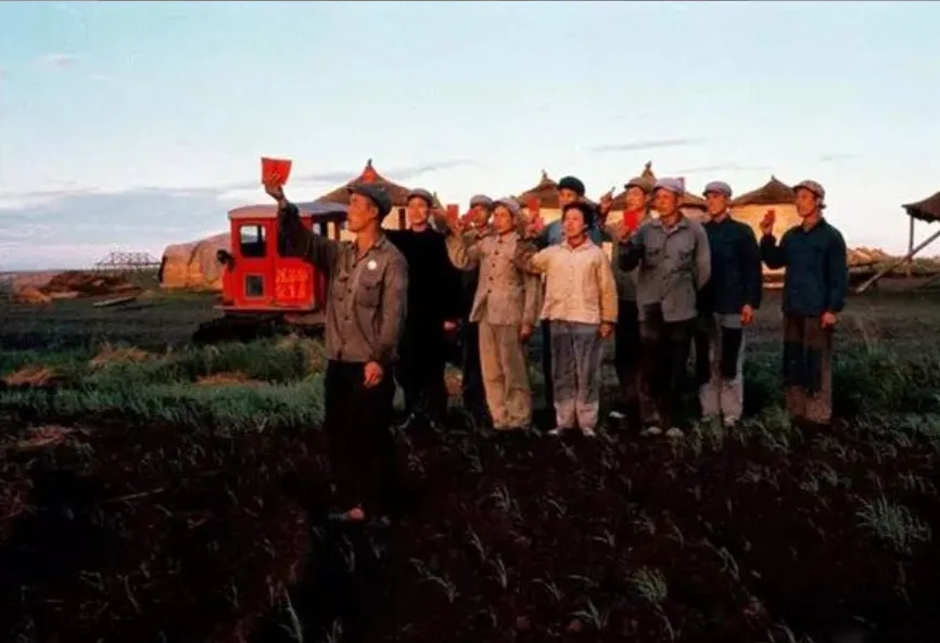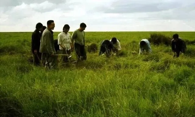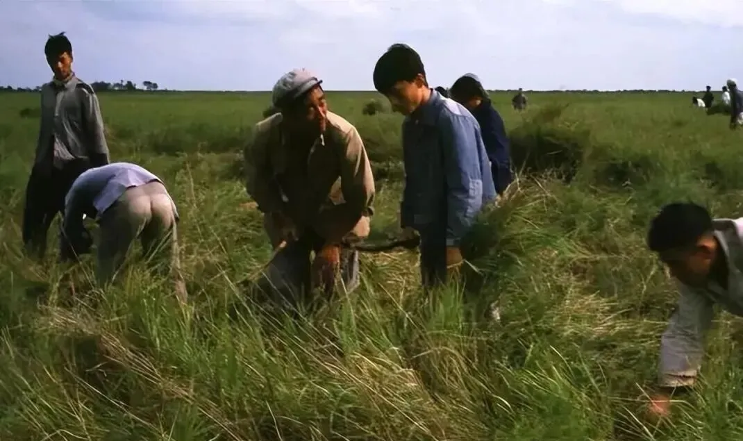 1968年,北大荒,在一望无际的草原或草甸上,人们弯着腰在草丛里劳作,有的在割草,有的在清理杂草。