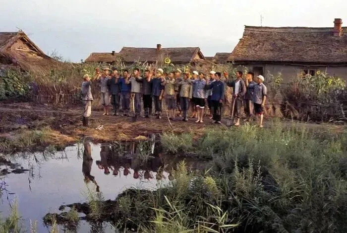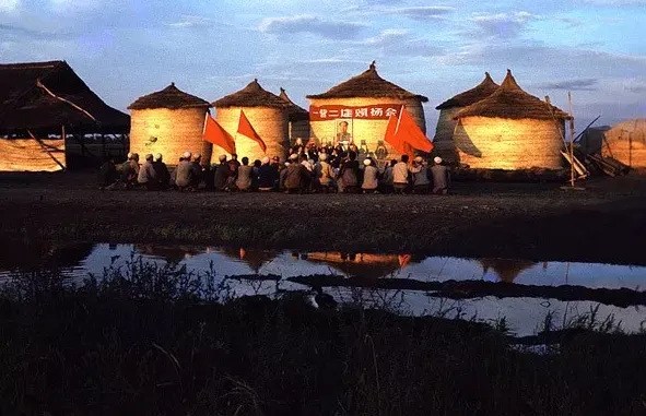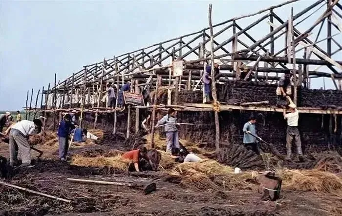 1968年,北大荒,知青们正在修建一座大型的土坯房,他们用泥土和稻草混合的材料来做墙体,有的在脚手架上作业,有的在地面运送材料,正在建造住房。