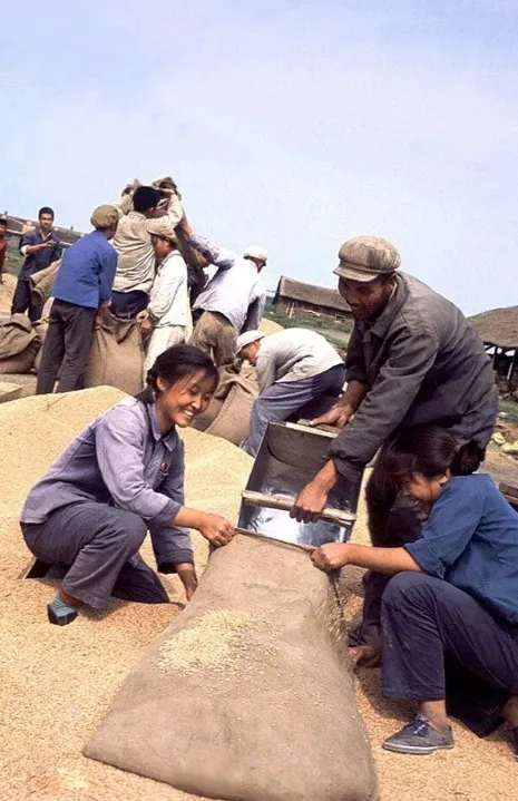 1968年,北大荒,在一个打谷场上,两名女青年和一名男社员正用工具将麦子装进麻袋,周围是堆积如山的粮食和简陋的仓库。