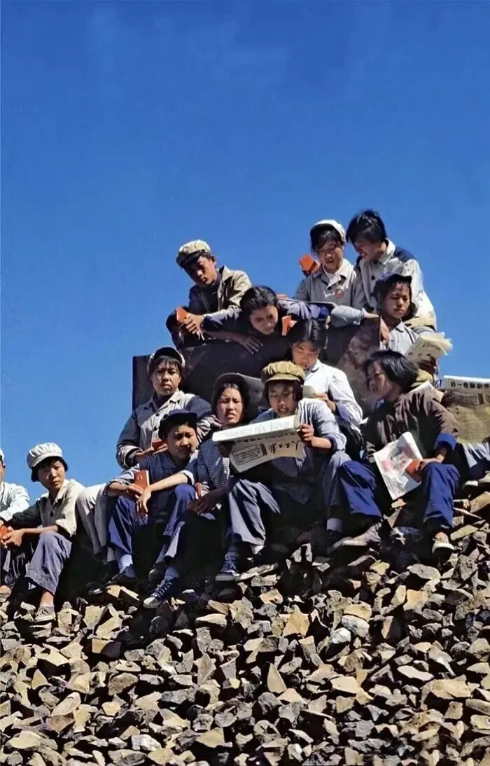 1968年,北大荒,一群识青在碎石坡上休息,他们围坐在一起,有人正在读报纸,其他人或倾听或望向镜头,知青们在学习与交流