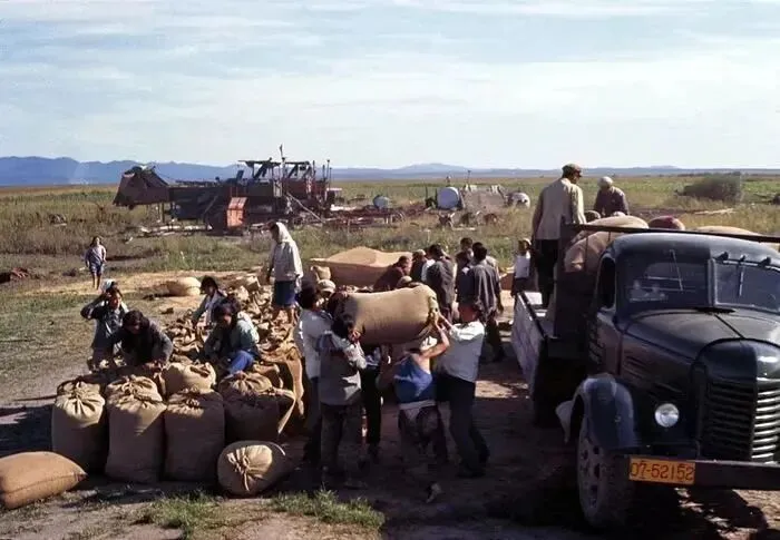 1968年,北大荒,在一片开阔的田野旁,知青们正忙碌地将装满粮食的麻袋搬运上卡车,远处还有联合收割机在作业