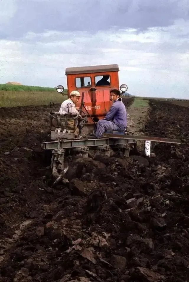 1968年,北大荒,两名知青坐在拖拉机后面,一名知青正驾驶着一台红色的履带式拖拉机在田地里犁地。