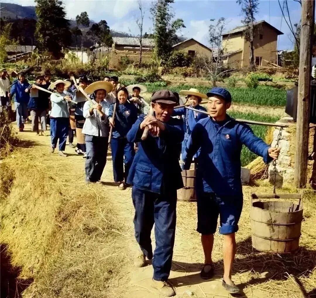 一群知青挑着水桶、扛着农具,走在乡间小路上