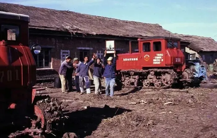 1968年,北大荒,几名知青站在两台东方红牌履带拖拉机前,他们高举手臂欢呼。