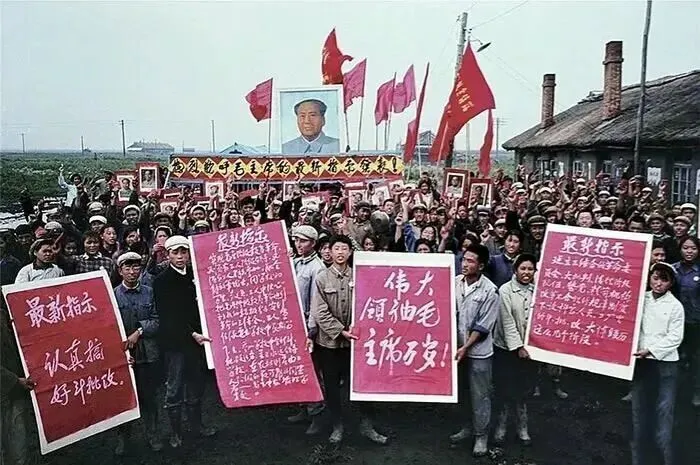 1968年,北大荒,人们高举着毛主席画像、红旗和写有 “伟大领袖毛主席万岁” 等口号的红色标语牌。