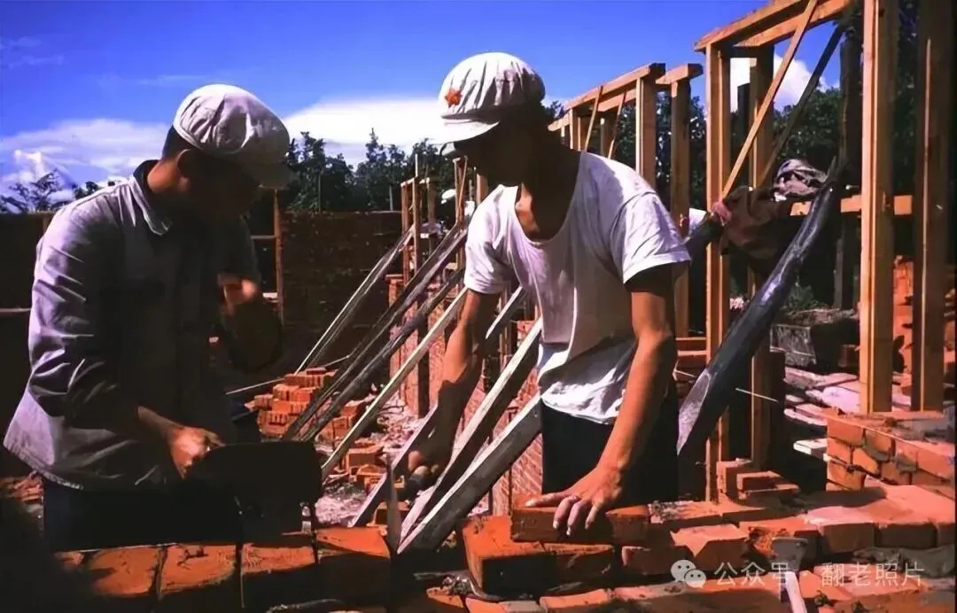1968年,北大荒,两名知青正在一处建筑工地上砌墙,他们熟练地使用瓦刀,将红砖一块块垒起,正在搭建的房子。