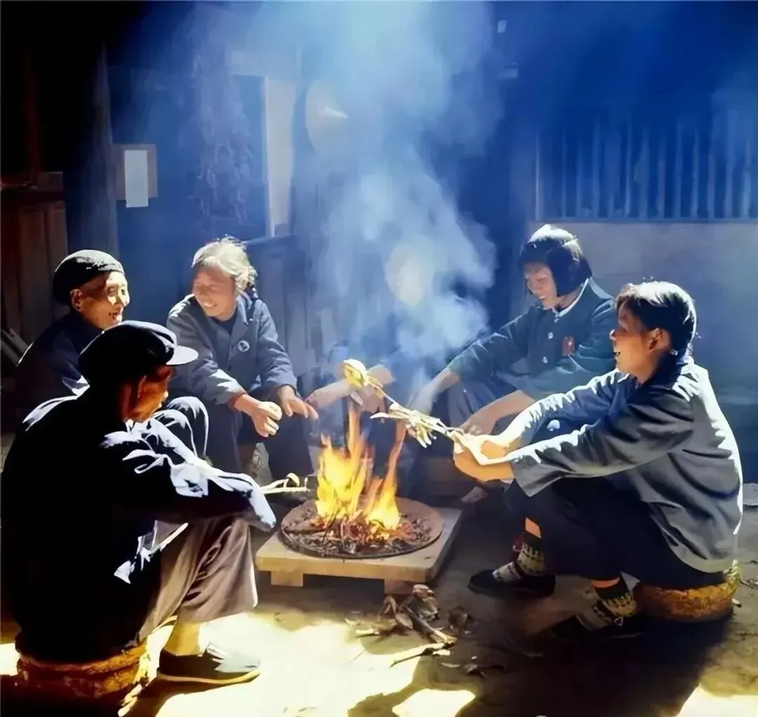 1968年,北大荒,在昏暗的屋子里,知青与当地百姓围坐在篝火旁,手里拿着树枝串着食物在火上烧烤,脸上都带着笑容。