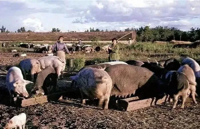 1968年,北大荒,在集体农场的养猪场里,两名女知青正在喂猪,他们提着饲料桶,看着成群的猪在食槽前进食。