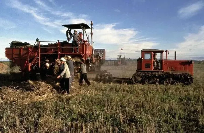 1968年,北大荒,麦田里,一台大型的红色联合收割机正在作业,几名知青在机器旁忙碌,有的在检查设备,有的在搬运收割的作物,旁边还有一台拖拉机配合运输。