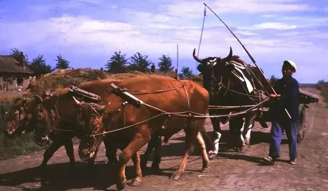 1968年,北大荒,一名社员牵着几头牛,拉着满载干草的牛车走在乡间土路上。