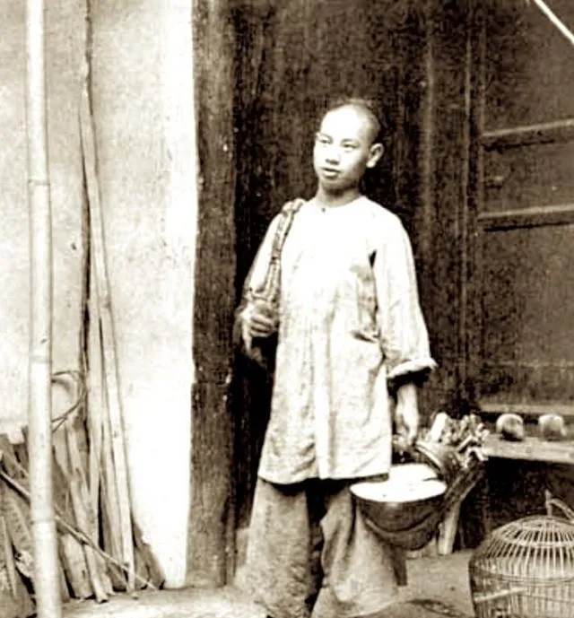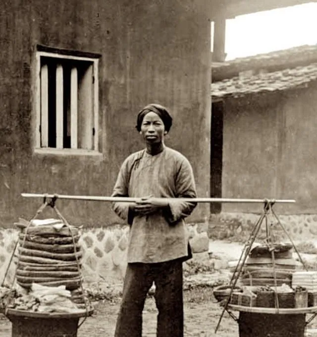 这位扛着长扁担的叫挑担小贩,两头藤篮一边装粗陶碗盏一边压着盐巴酱货,裤脚卷到膝头,脚上赤着,扁担磨得油光发亮,走起路来吱呀作响,妈妈看了笑,说这声响一来你就知道卖货的到口子上了,小时候我们追着担子跑,非要掰一截糖饼才肯回家,老板抹一把汗,嘴里还叮嘱别烫着手。