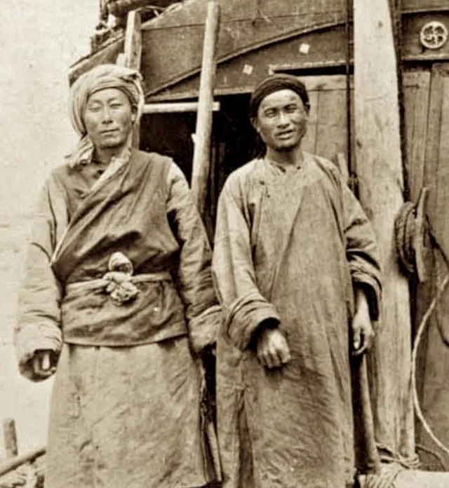 这身裹得厚实的就是川东民俗装束,上衣宽袖,腰间一束,面料粗松但耐磨,奔波的人图的就是结实,拍照的两位站得并肩,脸上的疲惫压不住眼里的精明劲儿,外婆见了说看样子走川藏线做小买卖的居多,风沙刮人脸,回到集镇洗把脸,照一张像,算是给自己留个凭证。