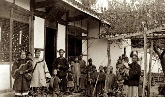 这张一家子站门口的就是乡绅人家的庭院合影,妇人旗装镶着窄边,孩子攥着衣角,院角竹架攀着枯藤,墙上一块块补丁似的灰影,是岁月抹出来的,拍照那一刻大家不笑,像是把日子按住了,舅舅打趣说以前照相稀罕,得穿体面点,现在随手一拍一大把,倒少了这股端正劲儿。