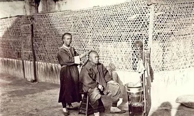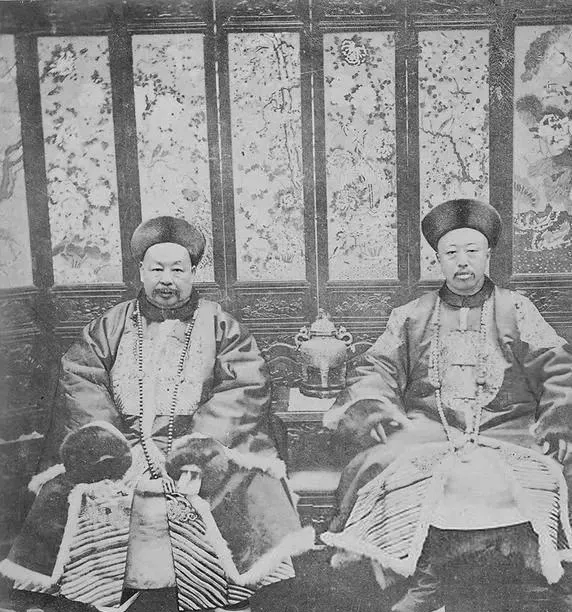 这两位穿着皮领大袍的叫清末权贵,身上挂着长串朝珠,坐姿不忙不迫,背后屏风绣着缠枝花鸟,桌面摆着一只小壶,气派是气派,可看久了心里发凉,朝堂越重器物就越厚重,人的命运在珠串之间打转,爷爷说那阵的规矩密得很,走一步都得照章,转头一看现在领导照相,西装一件轻轻松松,也算换了天地。
