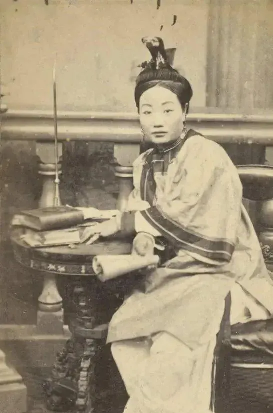 图中这位穿大袍的叫旗人女子,髻子梳得高,头面上大花压着,耳坠垂到颈边,袖口边一道明亮的滚边,站在靠背椅旁,指尖捏着手绢,整个人像被相机的目光拢住了,那会儿进相馆可稀罕,掌柜会先把布景拉好,再摆个立式灯,师傅喊一声别动,她就这么挺着身子,连呼吸都小了点,说是要显得端庄些。
