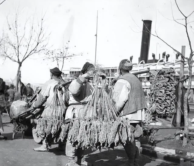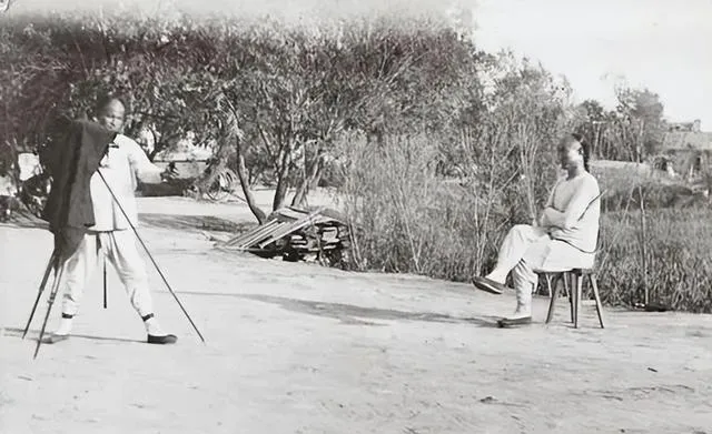 图里这位扛着三脚架的就是流动照相师,一块黑布往脑后一搭,咔嚓之前要先喊稳,坐在小凳上的客人弓着背,脚尖扣着地,树影斑驳,旁边还堆着木板和柴 bundles,那时候拍一张像要讲究日头、风向和耐心,哪有现在动不动十连拍的快活。