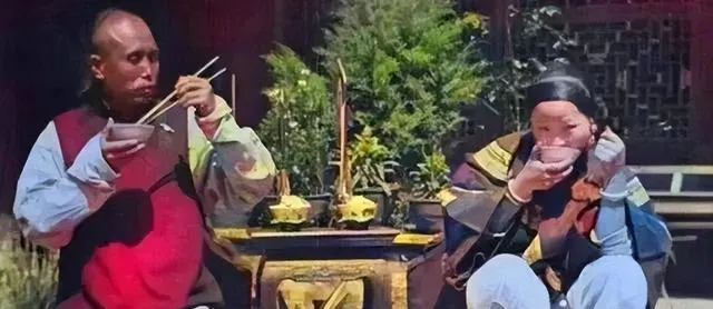 这张很家常,叫老照片里的吃饭,两个人端着白瓷碗,手里筷子不停,桌上摆着两只小炉,瞧着像热着的汤菜,男人抿嘴看人,女人低头喝汤,动作自然得很,以前吃饭多在院里,席地一坐也就开吃了,现在我们讲餐桌礼仪、烛光氛围,可肚子的满足呀,古今一个样。