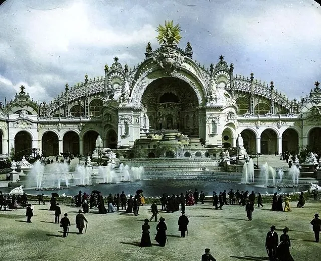 图中这座华丽的建筑是世博会主馆,白色立面堆满卷草与雕饰,圆拱像张开的贝壳,金色大日照在顶上,前面一圈喷泉,水柱有高有低,游客都穿长外套和礼帽,走在碎石路上咔吱作响,那时候的人觉得未来在眼前,现在我们再看,只剩一句感叹,人真会造梦。