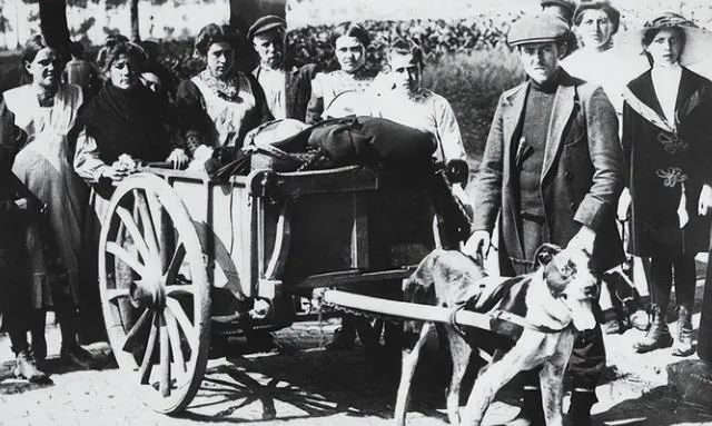 这辆车的轴高高的,木轮子宽,前面套的是一条狗,身子紧绷,人们围在后头,衣服褶子像一道道年纹,有时候命就是这样,能拉就拉着过,不能拉就歇,那时的布鲁塞尔,离家即远行,现在一张火车票,进出像眨眼。