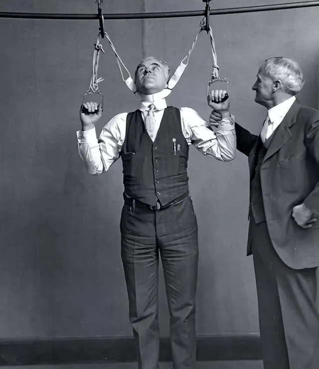 这套家伙把人从腋下和颈部吊起来,两头挂在滑轨上,旁边老先生把手搭在肩上,像在说再撑一会儿,以前追高靠物理,现在追高靠鞋垫,我妈看见这张笑我,别瞎学,脖子可不是橡皮筋。