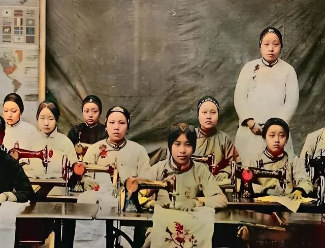 图中这一排桌上摆的是老式缝纫机,女孩们发髻低低的,衣襟绣着小花,针脚在压脚下噔噔响,老师站在后头盯着,像在说别抖手,踩板要匀,奶奶见着这一类照片就念叨,以前女孩子大门不出二门不迈,学的就是这两样,针线和规矩,现在按个键缝十样花样都不稀奇了。