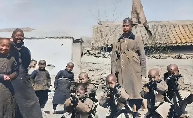 这个队列是在学堂外练射击的小家伙,棉袍鼓鼓的,枪口黑亮,站在一旁的大人裹着长大衣,神色严,小时候看电影里也有这样的镜头,可没这张这么实在,土墙裂缝都在那儿,那时候练的是胆子,现在娃娃握得多的是塑料把手的遥控器。